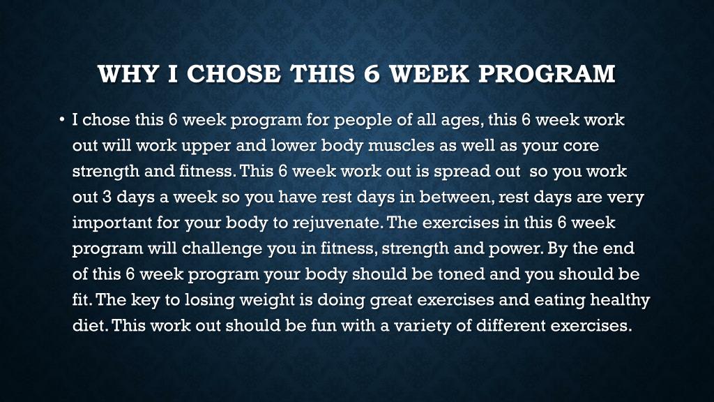Why I chose this 6 week program • I chose this 6 week program for people of all ages, this 6 week work out will work upper and lower body muscles as well as your core strength and fitness. This 6 week work out is spread out so you work out 3 days a week so you have rest days in between, rest days are very important for your body to rejuvenate. The exercises in this 6 week program will challenge you in fitness, strength and power. By the end of this 6 week program your body should be toned and you should be fit. The key to losing weight is doing great exercises and eating healthy diet. This work out should be fun with a variety of different exercises.
