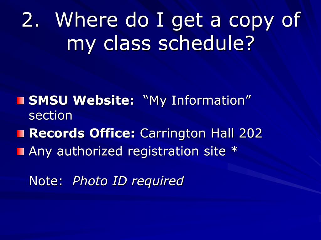 2. Where do I get a copy of my class schedule? • SMSU Website: “My Information” section • Records Office: Carrington Hall 202 • Any authorized registration site *Note: Photo ID required