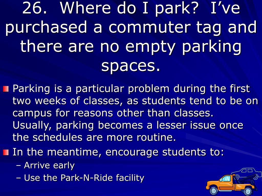 26. Where do I park? I’ve purchased a commuter tag and there are no empty parking spaces. • Parking is a particular problem during the first two weeks of classes, as students tend to be on campus for reasons other than classes. Usually, parking becomes a lesser issue once the schedules are more routine. • In the meantime, encourage students to: • Arrive early • Use the Park-N-Ride facility