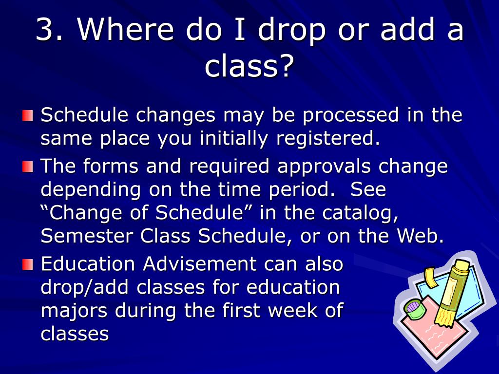 3. Where do I drop or add a class? • Schedule changes may be processed in the same place you initially registered. • The forms and required approvals change depending on the time period. See “Change of Schedule” in the catalog, Semester Class Schedule, or on the Web. • Education Advisement can also drop/add classes for education majors during the first week of classes