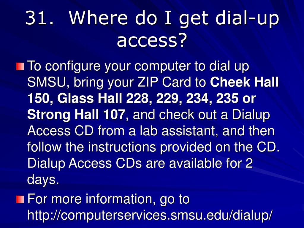 31. Where do I get dial-up access? • To configure your computer to dial up SMSU, bring your ZIP Card to Cheek Hall 150, Glass Hall 228, 229, 234, 235 or Strong Hall 107, and check out a Dialup Access CD from a lab assistant, and then follow the instructions provided on the CD. Dialup Access CDs are available for 2 days. • For more information, go to http://computerservices.smsu.edu/dialup/