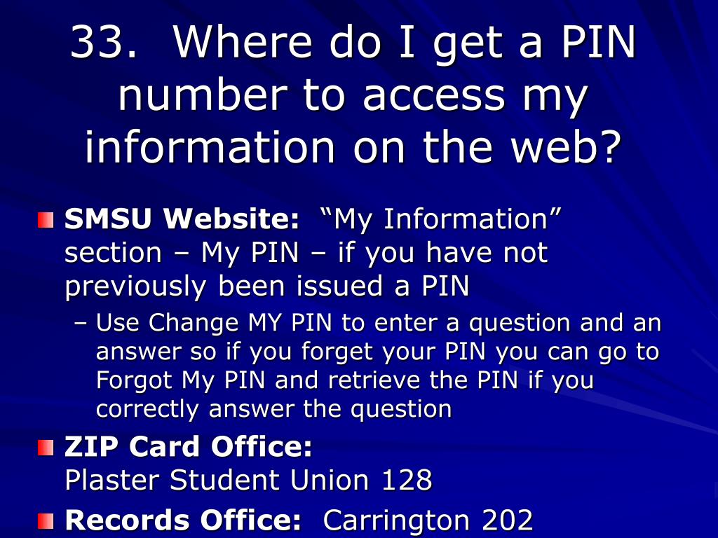 33. Where do I get a PIN number to access my information on the web? • SMSU Website: “My Information” section – My PIN – if you have not previously been issued a PIN • Use Change MY PIN to enter a question and an answer so if you forget your PIN you can go to Forgot My PIN and retrieve the PIN if you correctly answer the question • ZIP Card Office:Plaster Student Union 128 • Records Office: Carrington 202