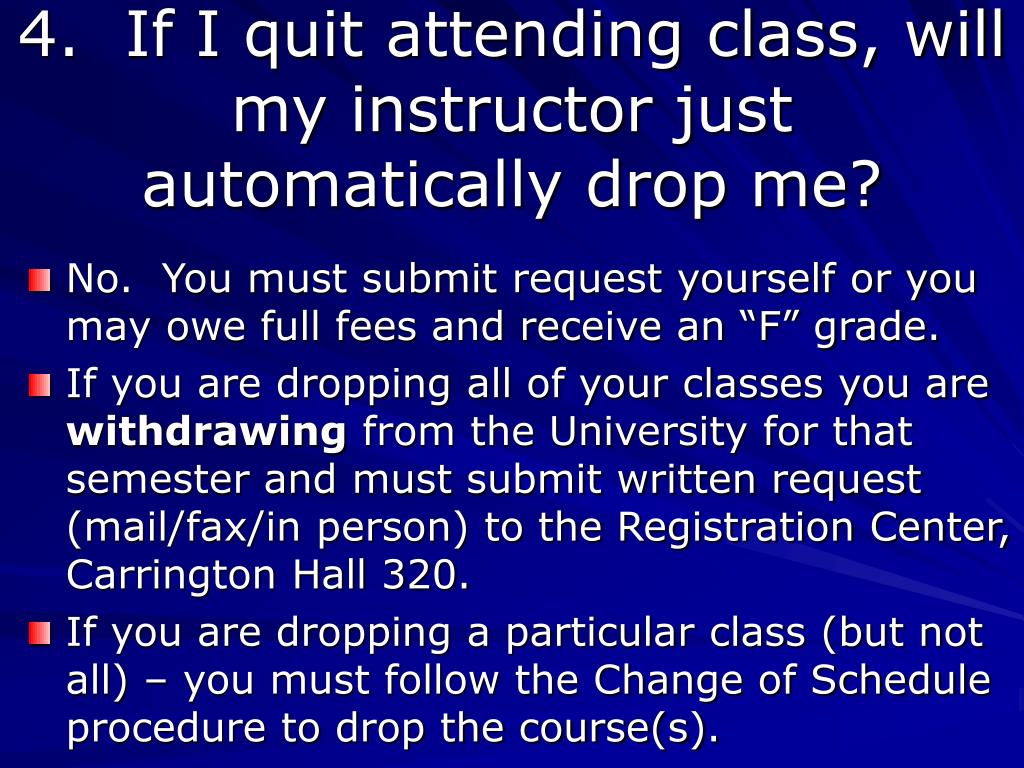 4. If I quit attending class, will my instructor just automatically drop me? • No. You must submit request yourself or you may owe full fees and receive an “F” grade. • If you are dropping all of your classes you are withdrawing from the University for that semester and must submit written request (mail/fax/in person) to the Registration Center, Carrington Hall 320. • If you are dropping a particular class (but not all) – you must follow the Change of Schedule procedure to drop the course(s).