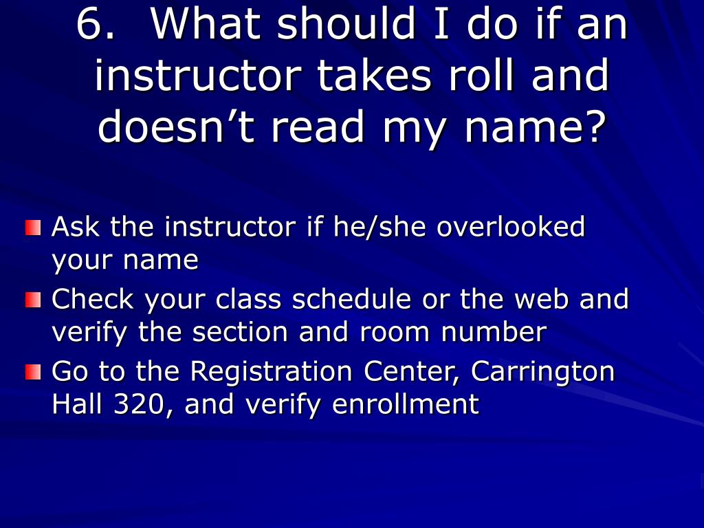6. What should I do if an instructor takes roll and doesn’t read my name? • Ask the instructor if he/she overlooked your name • Check your class schedule or the web and verify the section and room number • Go to the Registration Center, Carrington Hall 320, and verify enrollment
