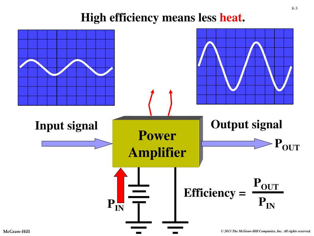 Electronics Principles & Applications Eighth Edition. Charles A. Schuler. Chapter 8 Large-Signal Amplifiers. INTRODUCTION. Amplifier Class Class A Class B Class AB Class C Class D. Output signal. Input signal. High efficiency means less heat. HEAT = P IN - P OUT. Power