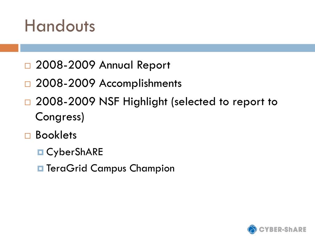 Handouts • 2008-2009 Annual Report • 2008-2009 Accomplishments • 2008-2009 NSF Highlight (selected to report to Congress) • Booklets • CyberShARE • TeraGrid Campus Champion