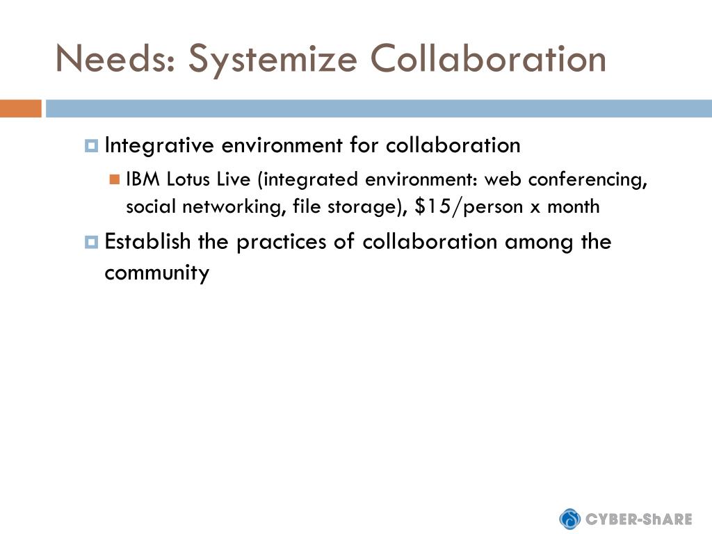 Needs: Systemize Collaboration • Integrative environment for collaboration • IBM Lotus Live (integrated environment: web conferencing, social networking, file storage), $15/person x month • Establish the practices of collaboration among the community