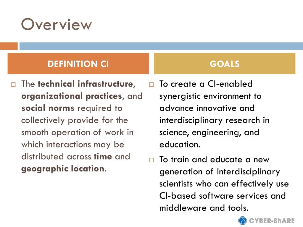 Overview DEFINITION CI GOALS • The technical infrastructure, organizational practices, and social norms required to collectively provide for the smooth operation of work in which interactions may be distributed across time and geographic location. • To create a CI-enabled synergistic environment to advance innovative and interdisciplinary research in science, engineering, and education. • To train and educate a new generation of interdisciplinary scientists who can effectively use CI-based software services and middleware and tools.