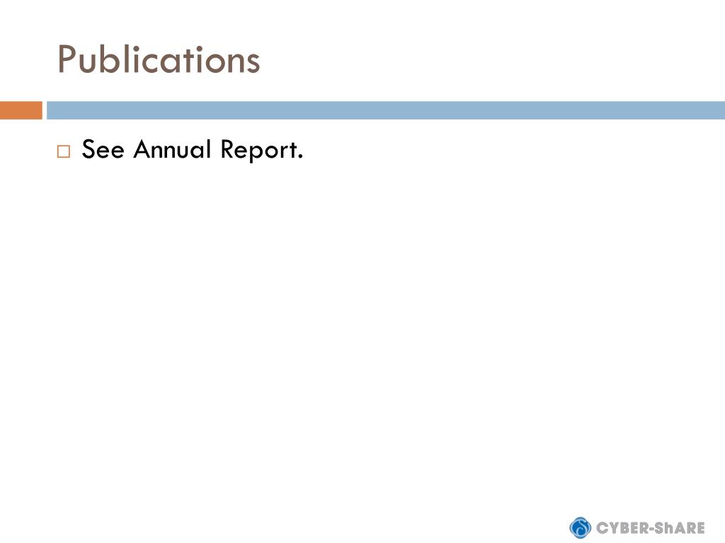 Feedback from Board of Advisors • Create a sustainability plan • Emphasize model for interdisciplinary student training • Be clear of award structure for faculty to become involved in CyberShARE • Demonstrate integration across projects • Develop statement for “Big Win” • Need to align with vision for IT and CI support
