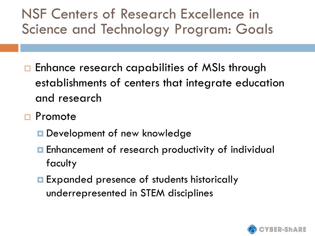 NSF Centers of Research Excellence in Science and Technology Program: Goals • Enhance research capabilities of MSIs through establishments of centers that integrate education and research • Promote • Development of new knowledge • Enhancement of research productivity of individual faculty • Expanded presence of students historically underrepresented in STEM disciplines