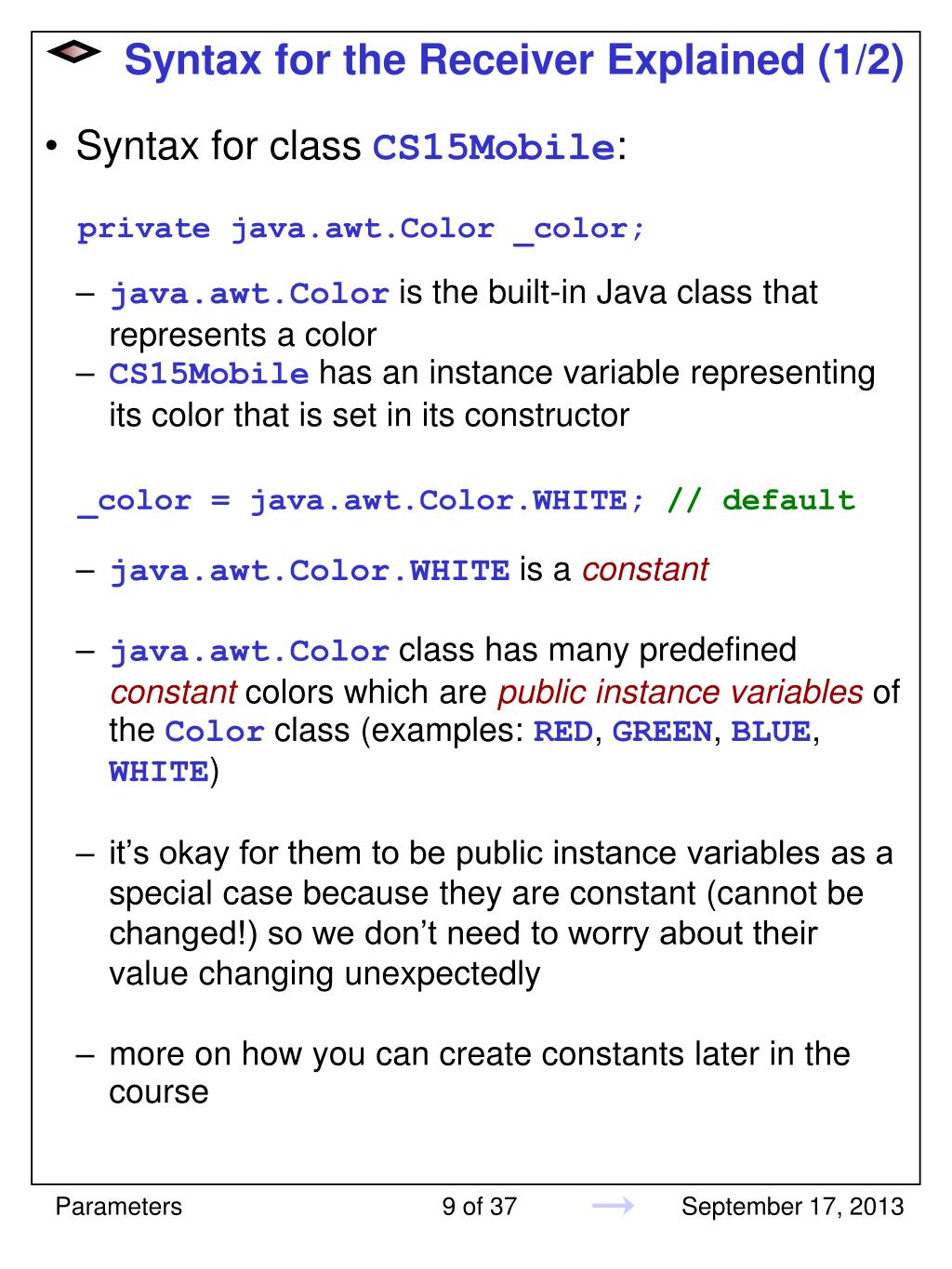 Syntax for the Receiver Explained (1/2) • Syntax for class CS15Mobile: private java.awt.Color _color; • java.awt.Color is the built-in Java class that represents a color • CS15Mobile has an instance variable representing its color that is set in its constructor _color = java.awt.Color.WHITE; // default • java.awt.Color.WHITEis a constant • java.awt.Color class has many predefined constantcolors which are public instance variables of the Color class (examples: RED, GREEN, BLUE, WHITE) • it’s okay for them to be public instance variables as a special case because they are constant (cannot be changed!) so we don’t need to worry about their value changing unexpectedly • more on how you can create constants later in the course Parameters 9 of 37