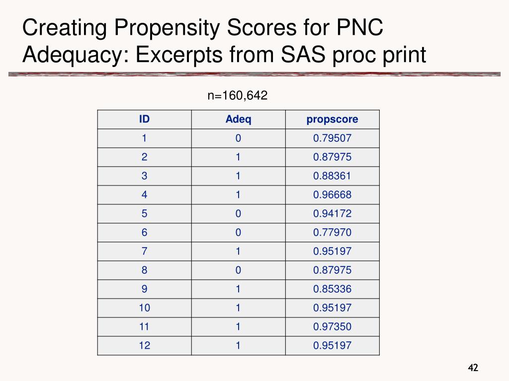 Creating Propensity Scores for PNC Adequacy: Excerpts from SAS proc print n=160,642 42