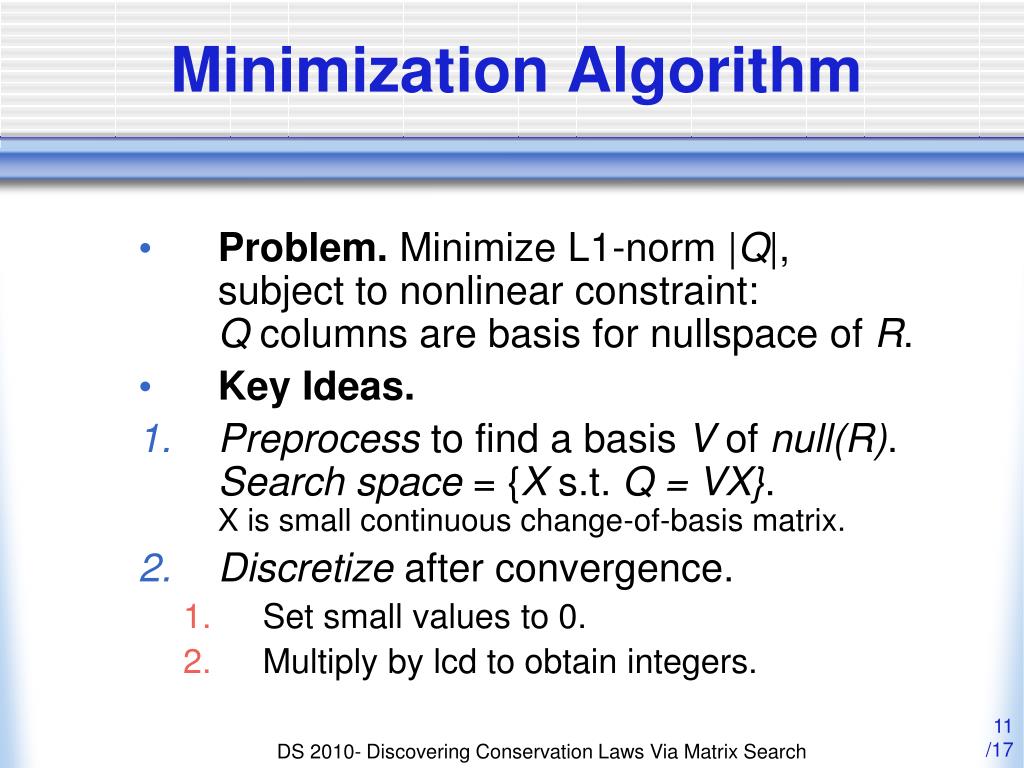 Minimization Algorithm • Problem. Minimize L1-norm |Q|, subject to nonlinear constraint: Q columns are basis for nullspace of R. • Key Ideas. • Preprocess to find a basis V of null(R). Search space = {Xs.t. Q = VX}.X is small continuous change-of-basis matrix. • Discretize after convergence. • Set small values to 0. • Multiply by lcd to obtain integers. DS 2010- Discovering Conservation Laws Via Matrix Search