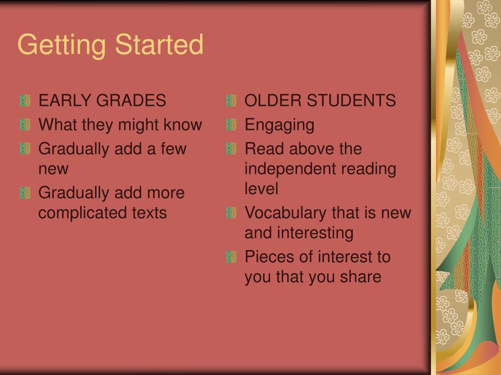 EARLY GRADES What they might know Gradually add a few new Gradually add more complicated texts OLDER STUDENTS Engaging Read above the independent reading level Vocabulary that is new and interesting Pieces of interest to you that you share Getting Started