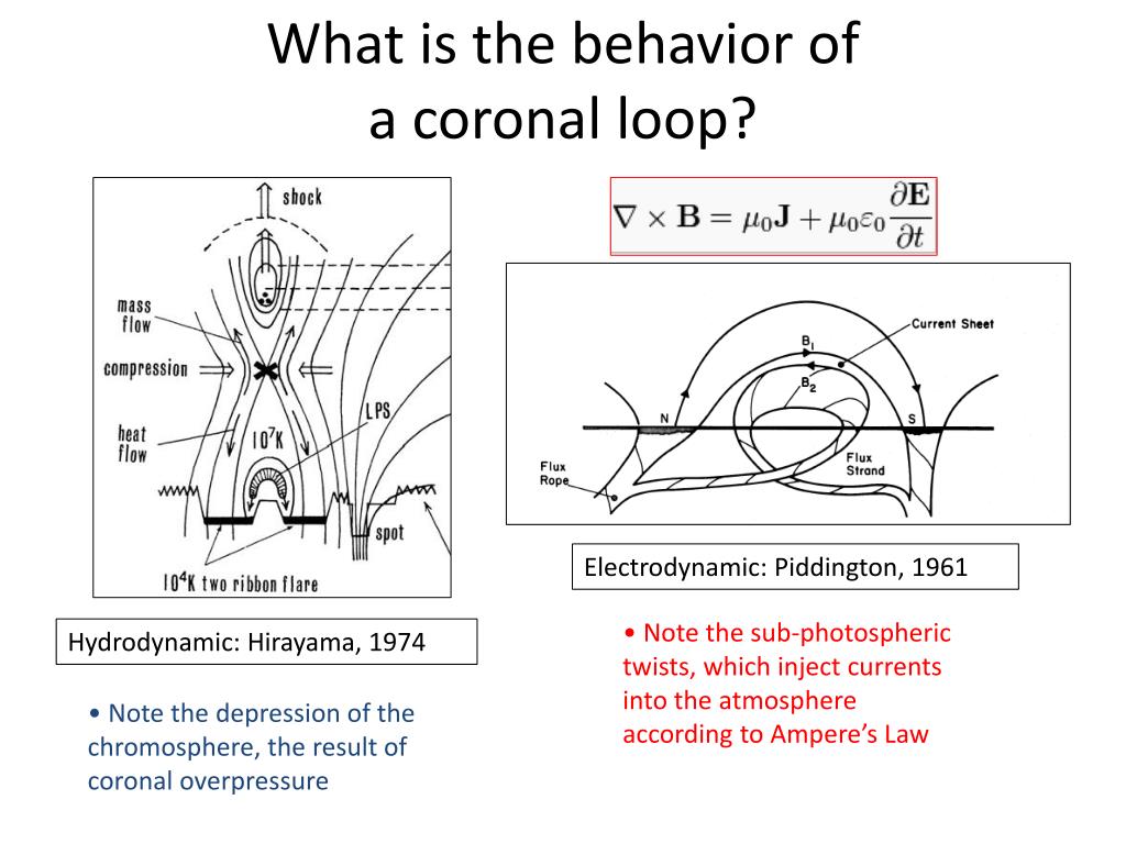 What is the behavior ofa coronal loop? Electrodynamic: Piddington, 1961 • Note the sub-photospheric twists, which inject currents into the atmosphere according to Ampere’s Law Hydrodynamic: Hirayama, 1974 • Note the depression of the chromosphere, the result of coronal overpressure