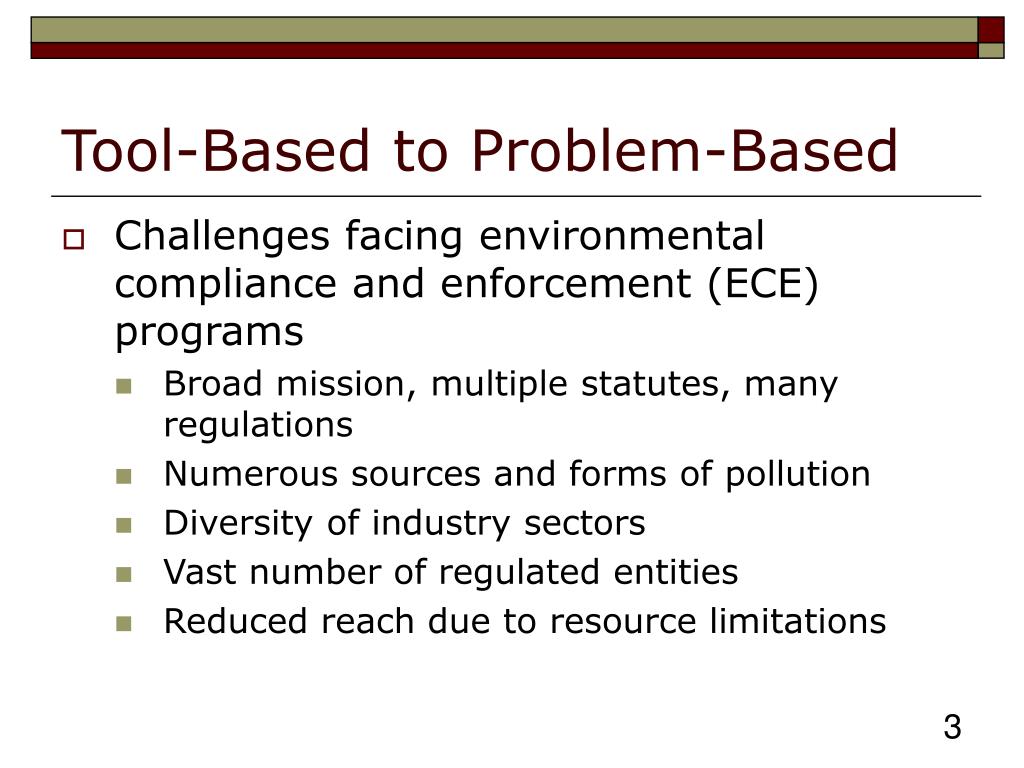Tool-Based to Problem-Based • Challenges facing environmental compliance and enforcement (ECE) programs • Broad mission, multiple statutes, many regulations • Numerous sources and forms of pollution • Diversity of industry sectors • Vast number of regulated entities • Reduced reach due to resource limitations
