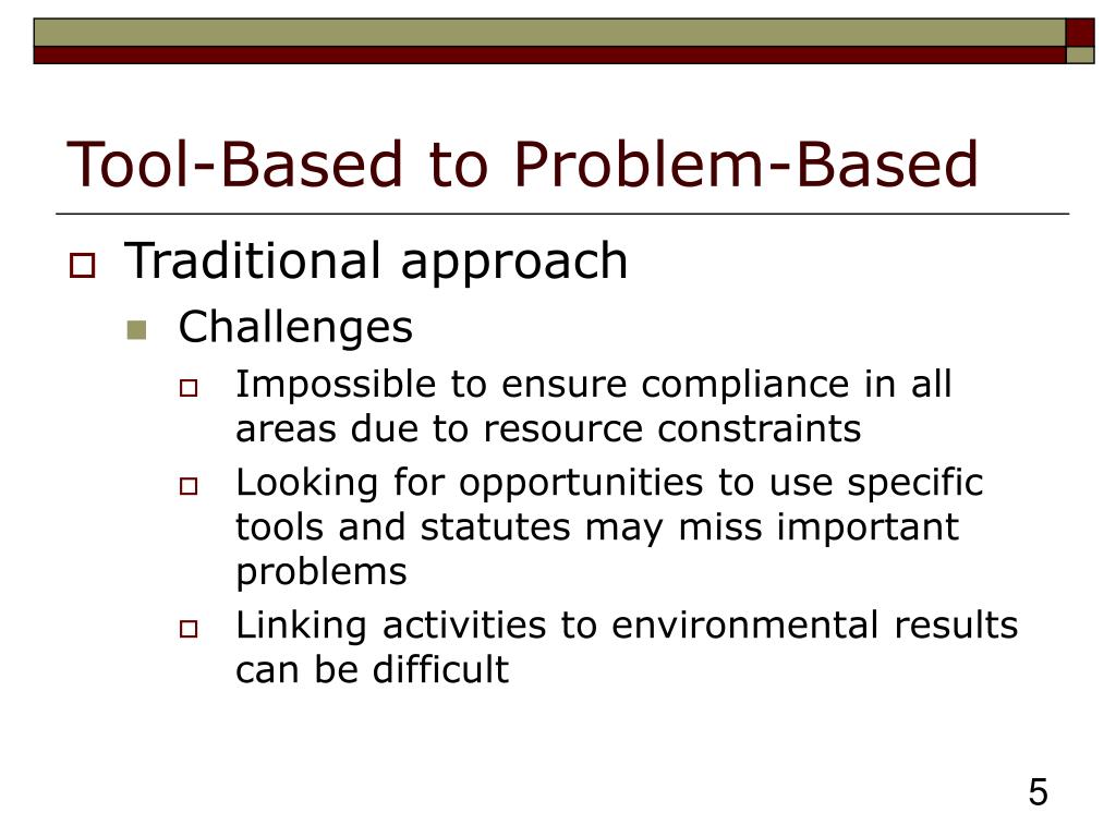 Tool-Based to Problem-Based • Traditional approach • Challenges • Impossible to ensure compliance in all areas due to resource constraints • Looking for opportunities to use specific tools and statutes may miss important problems • Linking activities to environmental results can be difficult
