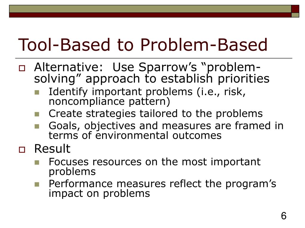 Tool-Based to Problem-Based • Alternative: Use Sparrow’s “problem-solving” approach to establish priorities • Identify important problems (i.e., risk, noncompliance pattern) • Create strategies tailored to the problems • Goals, objectives and measures are framed in terms of environmental outcomes • Result • Focuses resources on the most important problems • Performance measures reflect the program’s impact on problems