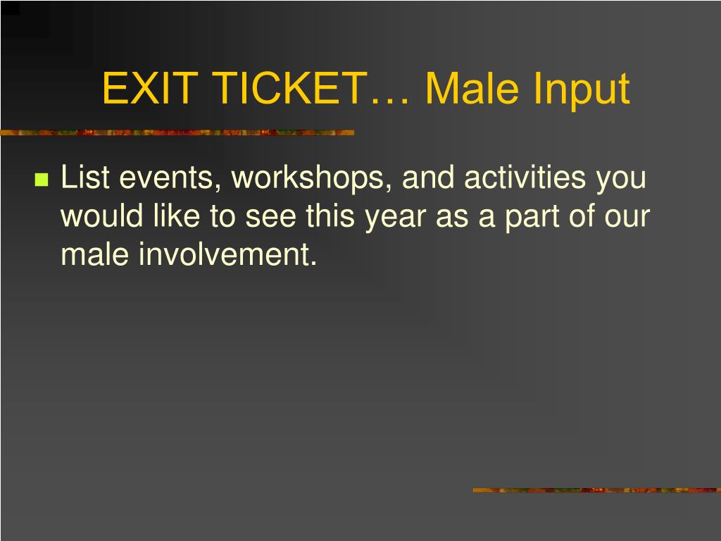 EXIT TICKET… Male Input • List events, workshops, and activities you would like to see this year as a part of our male involvement.