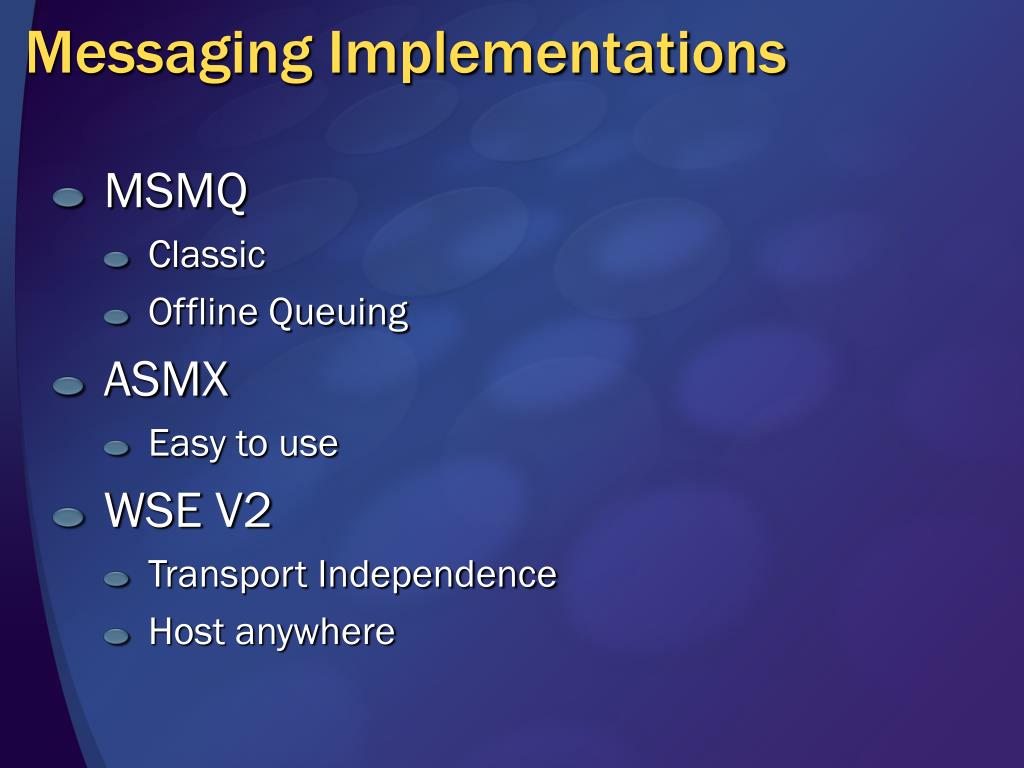 Messaging Implementations • MSMQ • Classic • Offline Queuing • ASMX • Easy to use • WSE V2 • Transport Independence • Host anywhere