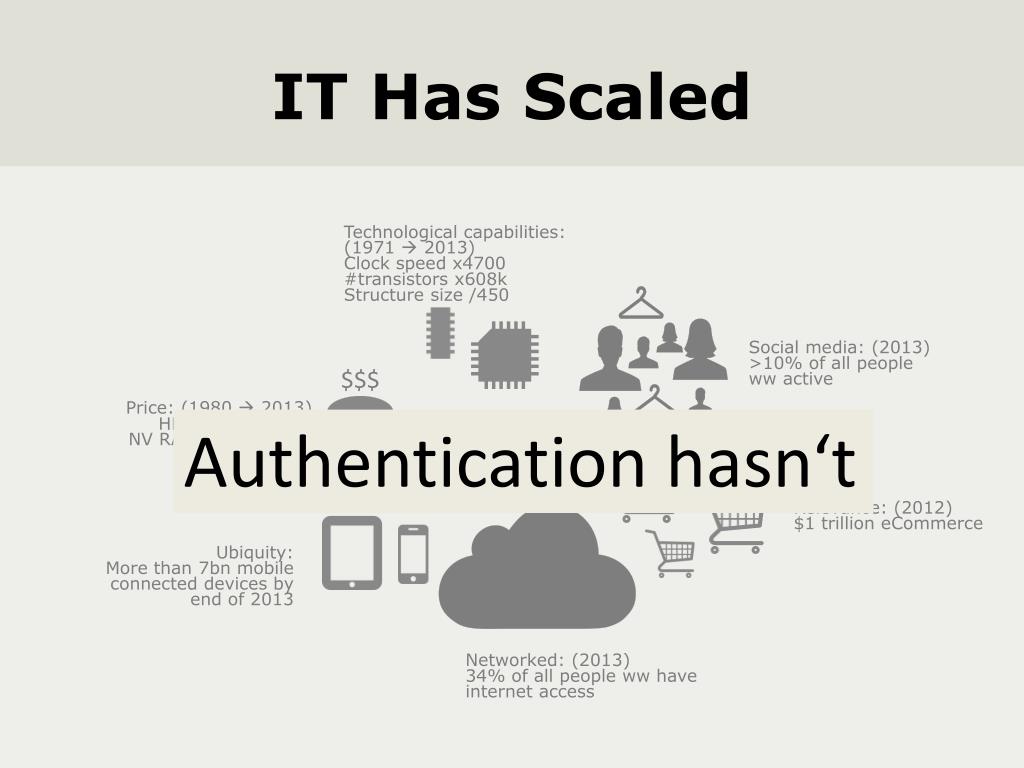 IT Has Scaled Technological capabilities: (1971 2013) Clock speed x4700 #transistors x608k Structure size /450 $$$ Social media: (2013) >10% of all people ww active Price: (1980 2013) HDD $/MB /12k NV RAM $/MB /1.3m Authentication hasn‘t Relevance: (2012) $1 trillion eCommerce Ubiquity: More than 7bn mobile connected devices by end of 2013 Networked: (2013) 34% of all people ww have internet access