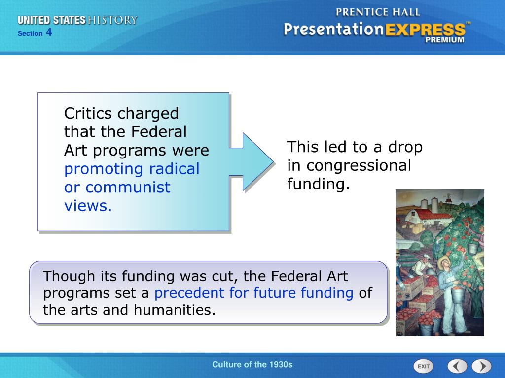Critics charged that the Federal Art programs werepromoting radical or communist views. This led to a drop in congressional funding. Though its funding was cut, the Federal Art programsset a precedent for future funding of the arts and humanities.
