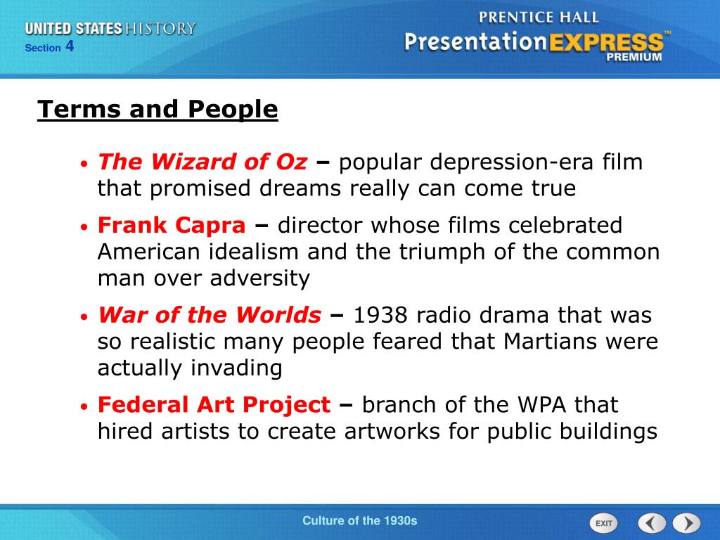 Terms and People • The Wizard of Oz– popular depression-era film that promised dreams really can come true • Frank Capra – director whose films celebrated American idealism and the triumph of the common man over adversity • War of the Worlds – 1938 radio drama that was so realistic many people feared that Martians were actually invading • Federal Art Project – branch of the WPA that hired artists to create artworks for public buildings