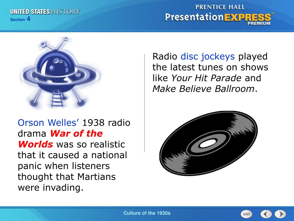 Radio disc jockeys played the latest tunes on shows like Your Hit Parade and Make Believe Ballroom. Orson Welles’ 1938 radio drama War of the Worlds was so realistic that it caused a national panic when listeners thought that Martians were invading.