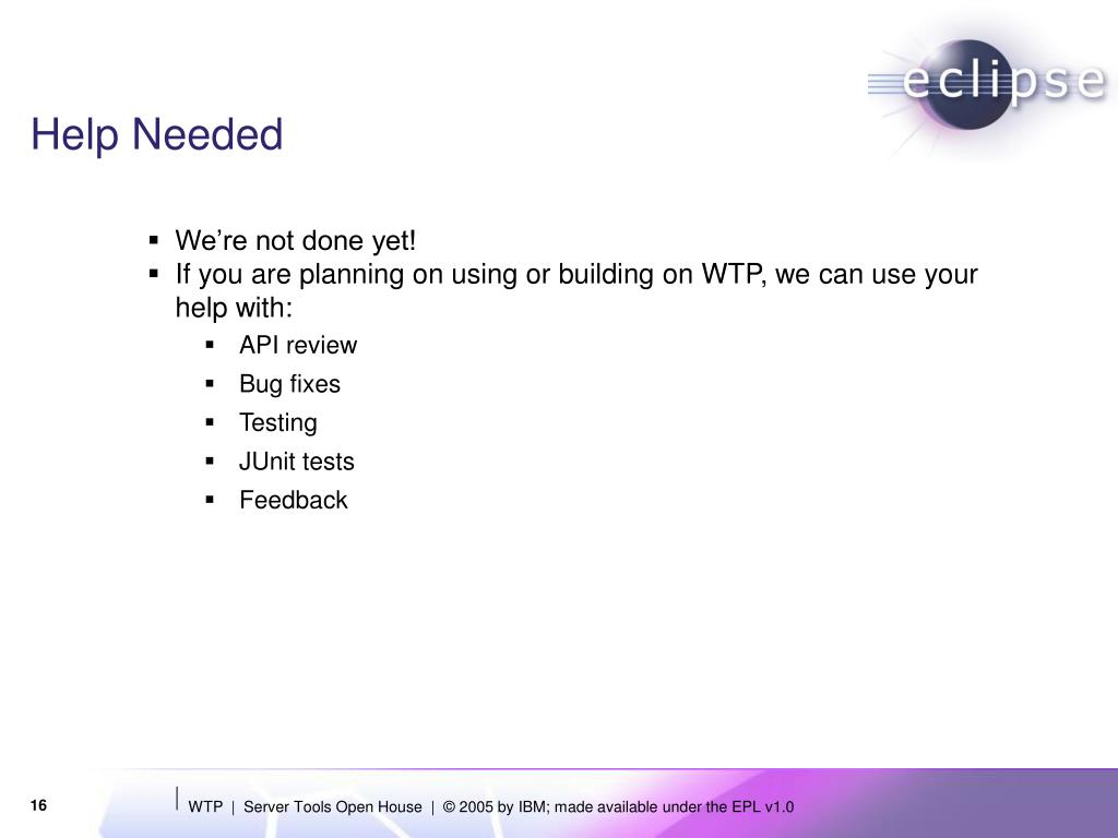 Help Needed • We’re not done yet! • If you are planning on using or building on WTP, we can use your help with: • API review • Bug fixes • Testing • JUnit tests • Feedback