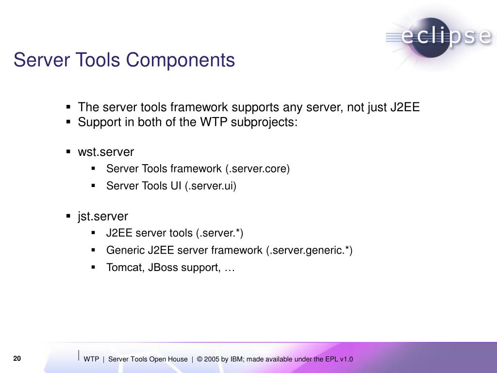Server Tools Components • The server tools framework supports any server, not just J2EE • Support in both of the WTP subprojects: • wst.server • Server Tools framework (.server.core) • Server Tools UI (.server.ui) • jst.server • J2EE server tools (.server.*) • Generic J2EE server framework (.server.generic.*) • Tomcat, JBoss support, …