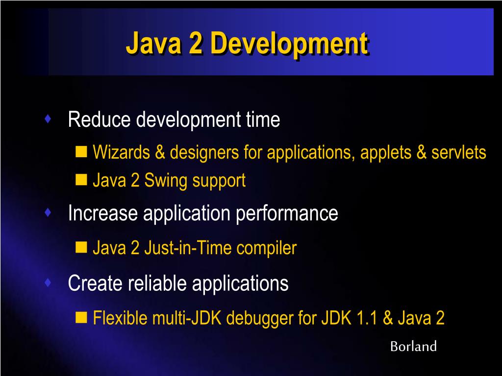 Java 2 Development • Reduce development time • Wizards & designers for applications, applets & servlets • Java 2 Swing support • Increase application performance • Java 2 Just-in-Time compiler • Create reliable applications • Flexible multi-JDK debugger for JDK 1.1 & Java 2