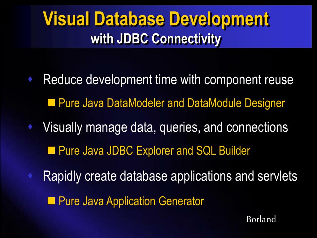 Visual Database Developmentwith JDBC Connectivity • Reduce development time with component reuse • Pure Java DataModelerand DataModule Designer • Visually manage data, queries, and connections • Pure Java JDBC Explorer and SQL Builder • Rapidly create database applications and servlets • Pure Java Application Generator