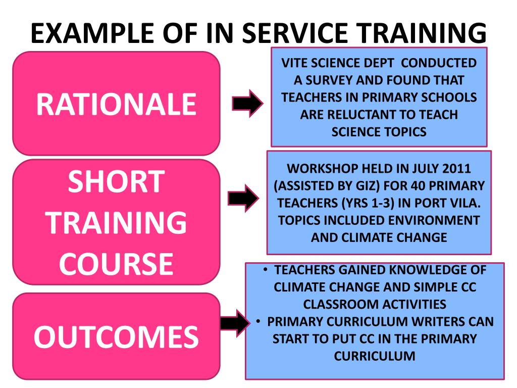 EXAMPLE OF IN SERVICE TRAINING VITE SCIENCE DEPT CONDUCTED A SURVEY AND FOUND THAT TEACHERS IN PRIMARY SCHOOLS ARE RELUCTANT TO TEACH SCIENCE TOPICS RATIONALE WORKSHOP HELD IN JULY 2011 (ASSISTED BY GIZ) FOR 40 PRIMARY TEACHERS (YRS 1-3) IN PORT VILA. TOPICS INCLUDED ENVIRONMENT AND CLIMATE CHANGE SHORT TRAINING COURSE • TEACHERS GAINED KNOWLEDGE OF CLIMATE CHANGE AND SIMPLE CC CLASSROOM ACTIVITIES • PRIMARY CURRICULUM WRITERS CAN START TO PUT CC IN THE PRIMARY CURRICULUM OUTCOMES