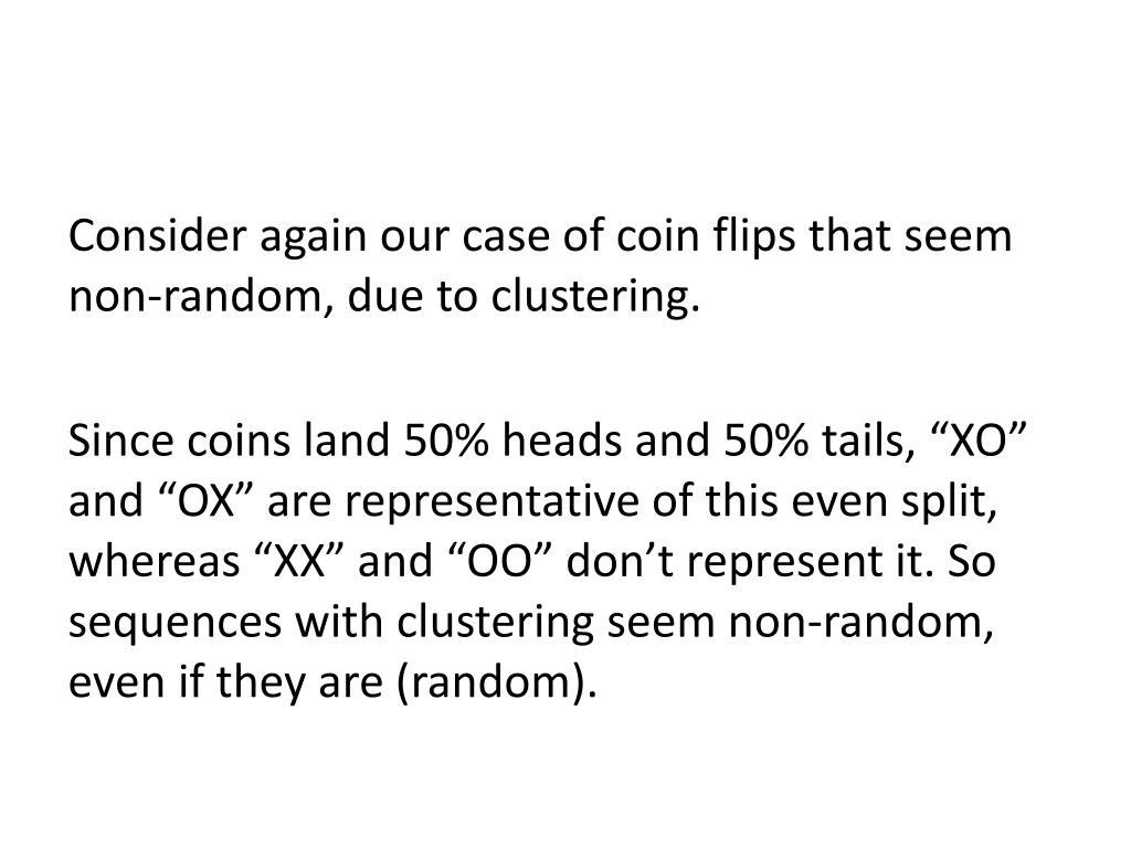 Consider again our case of coin flips that seem non-random, due to clustering. Since coins land 50% heads and 50% tails, “XO” and “OX” are representative of this even split, whereas “XX” and “OO” don’t represent it. So sequences with clustering seem non-random, even if they are (random).