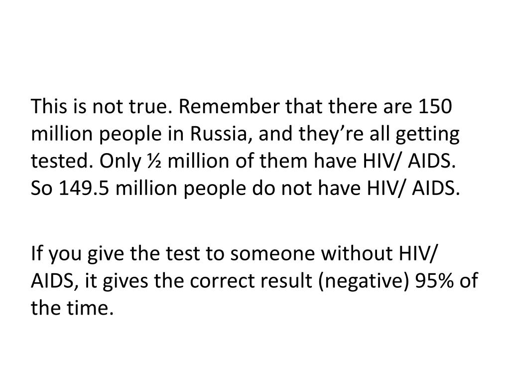 This is not true. Remember that there are 150 million people in Russia, and they’re all getting tested. Only ½ million of them have HIV/ AIDS. So 149.5 million people do not have HIV/ AIDS. If you give the test to someone without HIV/ AIDS, it gives the correct result (negative) 95% of the time.