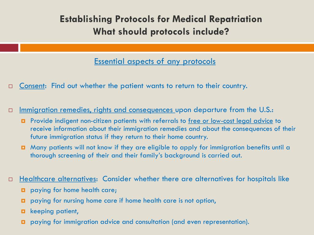 Establishing Protocols for Medical RepatriationWhat should protocols include? Essential aspects of any protocols • Consent: Find out whether the patient wants to return to their country. • Immigration remedies, rights and consequences upon departure from the U.S.: • Provide indigent non-citizen patients with referrals to free or low-cost legal advice to receive information about their immigration remedies and about the consequences of their future immigration status if they return to their home country. • Many patients will not know if they are eligible to apply for immigration benefits until a thorough screening of their and their family’s background is carried out. • Healthcare alternatives: Consider whether there are alternatives for hospitals like • paying for home health care; • paying for nursing home care if home health care is not option, • keeping patient, • paying for immigration advice and consultation (and even representation).