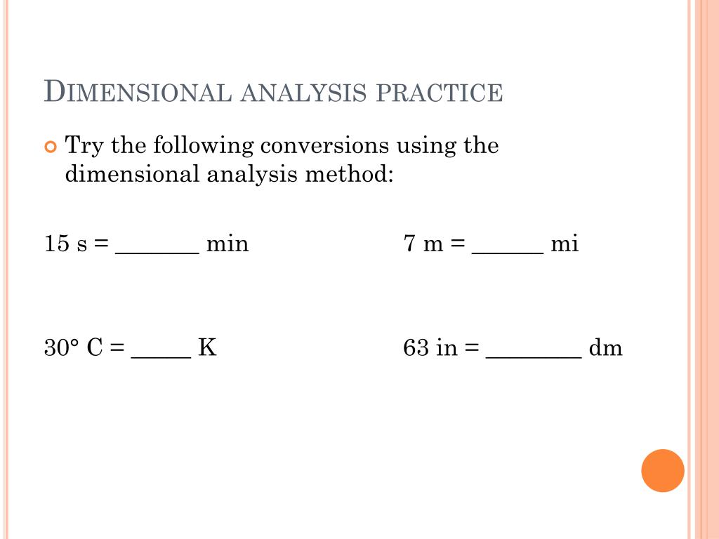 Dimensional analysis practice • Try the following conversions using the dimensional analysis method: 15 s = _______ min 7 m = ______ mi 30° C = _____ K 63 in = ________ dm