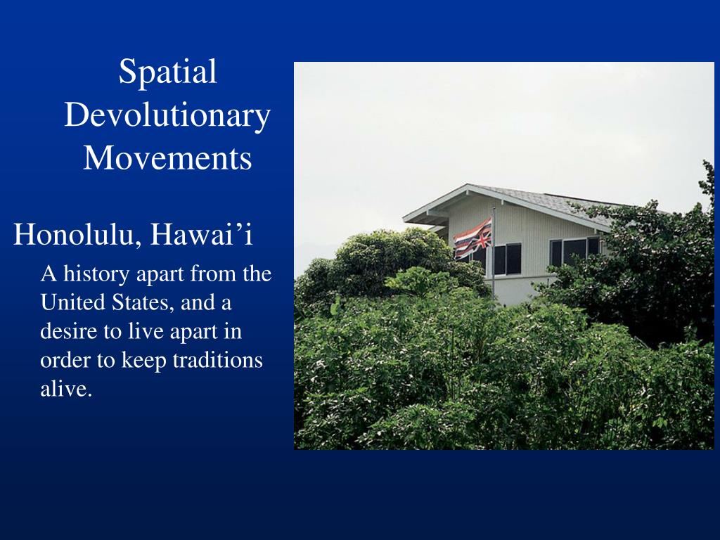 Spatial Devolutionary Movements Honolulu, Hawai’i A history apart from the United States, and a desire to live apart in order to keep traditions alive.
