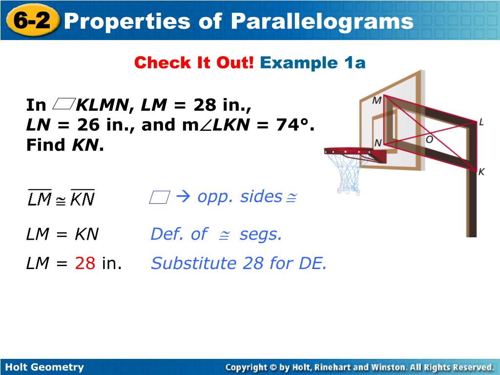 opp. sides Check It Out! Example 1a In KLMN, LM = 28 in., LN = 26 in., and mLKN = 74°. Find KN. LM = KN Def. of segs. LM = 28 in. Substitute 28 for DE.