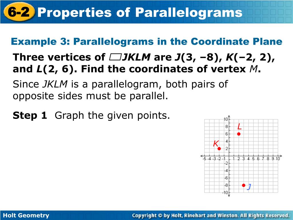 L K J Example 3: Parallelograms in the Coordinate Plane Three vertices of JKLM are J(3, –8), K(–2, 2), and L(2, 6). Find the coordinates of vertex M. Since JKLM is a parallelogram, both pairs of opposite sides must be parallel. Step 1 Graph the given points.