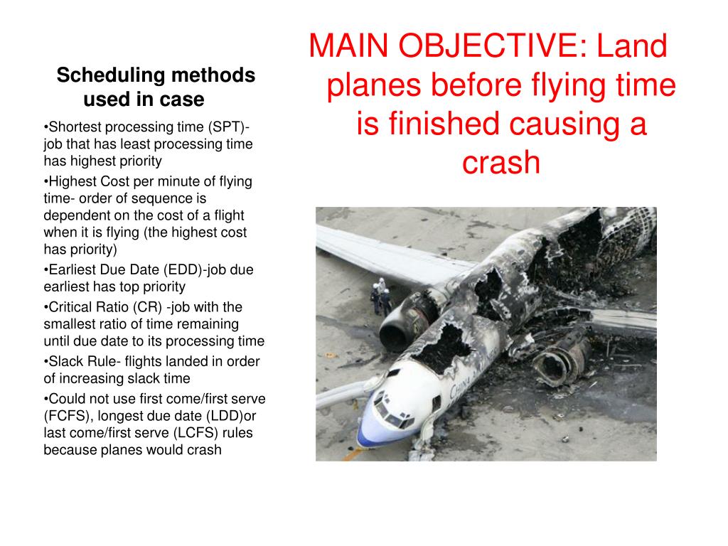 Scheduling methods used in case MAIN OBJECTIVE: Land planes before flying time is finished causing a crash Shortest processing time (SPT)- job that has least processing time has highest priority Highest Cost per minute of flying time- order of sequence is dependent on the cost of a flight when it is flying (the highest cost has priority) Earliest Due Date (EDD)-job due earliest has top priority Critical Ratio (CR) -job with the smallest ratio of time remaining until due date to its processing time Slack Rule- flights landed in order of increasing slack time Could not use first come/first serve (FCFS), longest due date (LDD)or last come/first serve (LCFS) rules because planes would crash