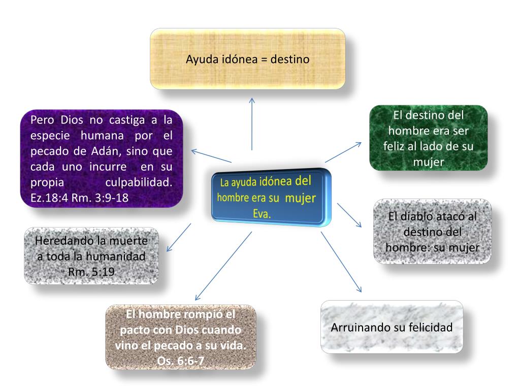 Ayuda idónea = destino El destino del hombre era ser feliz al lado de su mujer Pero Dios no castiga a la especie humana por el pecado de Adán, sino que cada uno incurre en su propia culpabilidad. Ez.18:4 Rm. 3:9-18 La ayuda idónea del hombre era su mujer Eva. El diablo atacó al destino del hombre: su mujer Heredando la muerte a toda la humanidad Rm. 5:19 Arruinando su felicidad El hombre rompió el pacto con Dios cuando vino el pecado a su vida. Os. 6:6-7