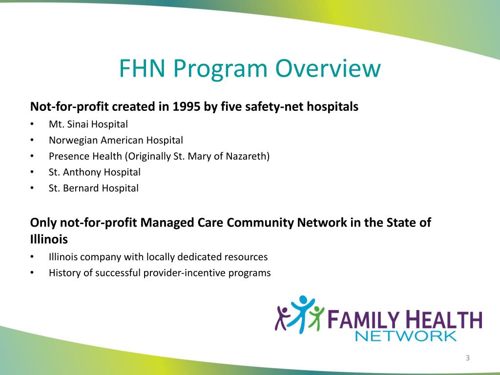 FHN Program Overview Not-for-profit created in 1995 by five safety-net hospitals • Mt. Sinai Hospital • Norwegian American Hospital • Presence Health (Originally St. Mary of Nazareth) • St. Anthony Hospital • St. Bernard Hospital Only not-for-profit Managed Care Community Network in the State of Illinois • Illinois company with locally dedicated resources • History of successful provider-incentive programs