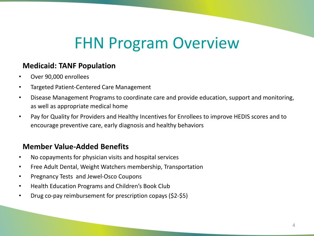 FHN Program Overview Medicaid: TANF Population • Over 90,000 enrollees • Targeted Patient-Centered Care Management • Disease Management Programs to coordinate care and provide education, support and monitoring, as well as appropriate medical home • Pay for Quality for Providers and Healthy Incentives for Enrollees to improve HEDIS scores and to encourage preventive care, early diagnosis and healthy behaviors Member Value-Added Benefits • No copayments for physician visits and hospital services • Free Adult Dental, Weight Watchers membership, Transportation • Pregnancy Tests and Jewel-Osco Coupons • Health Education Programs and Children’s Book Club • Drug co-pay reimbursement for prescription copays ($2-$5)