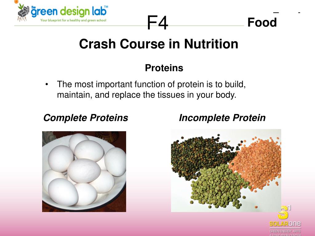 F4 Crash Course in Nutrition Complete Proteins Proteins • The most important function of protein is to build, maintain, and replace the tissues in your body. Incomplete Protein