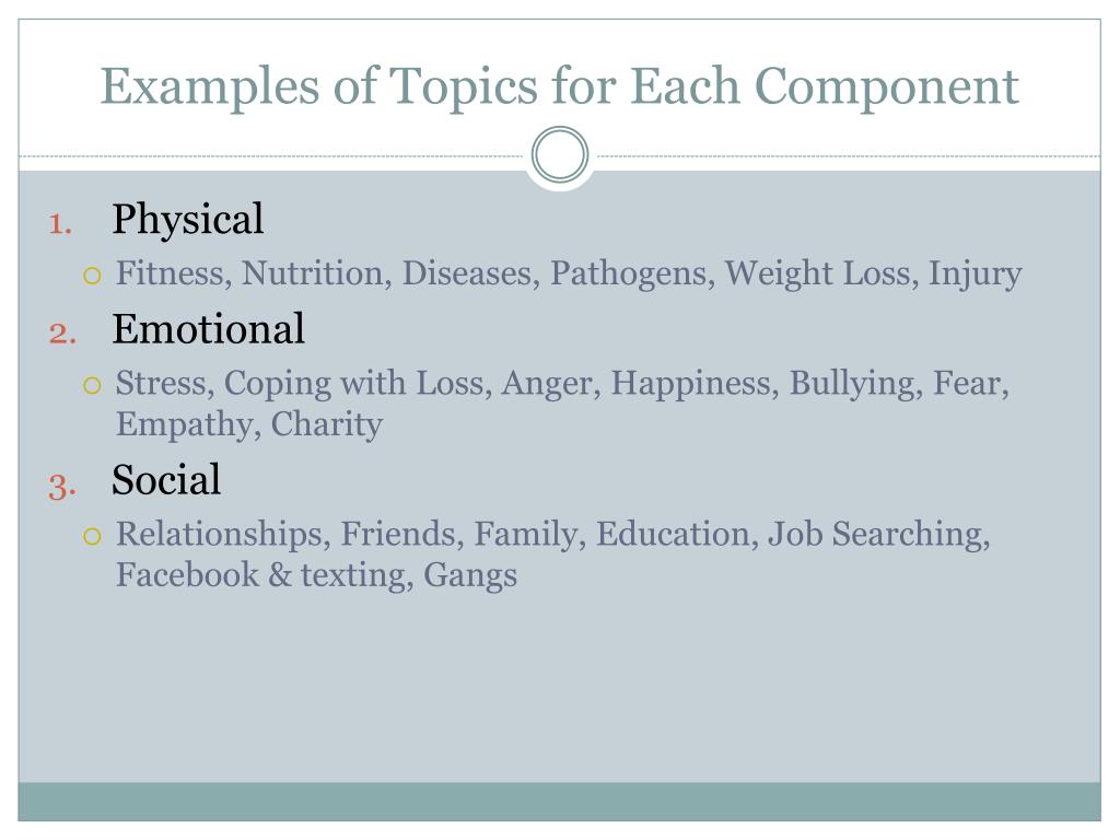 Examples of Topics for Each Component • Physical • Fitness, Nutrition, Diseases, Pathogens, Weight Loss, Injury • Emotional • Stress, Coping with Loss, Anger, Happiness, Bullying, Fear, Empathy, Charity • Social • Relationships, Friends, Family, Education, Job Searching, Facebook & texting, Gangs