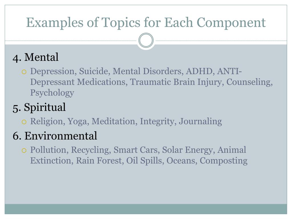 Examples of Topics for Each Component 4. Mental • Depression, Suicide, Mental Disorders, ADHD, ANTI-Depressant Medications, Traumatic Brain Injury, Counseling, Psychology 5. Spiritual • Religion, Yoga, Meditation, Integrity, Journaling 6. Environmental • Pollution, Recycling, Smart Cars, Solar Energy, Animal Extinction, Rain Forest, Oil Spills, Oceans, Composting