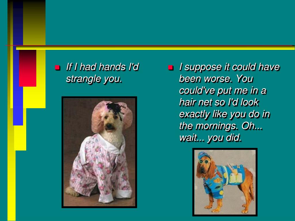 If I had hands I'd strangle you. • I suppose it could have been worse. You could've put me in a hair net so I'd look exactly like you do in the mornings. Oh... wait... you did.