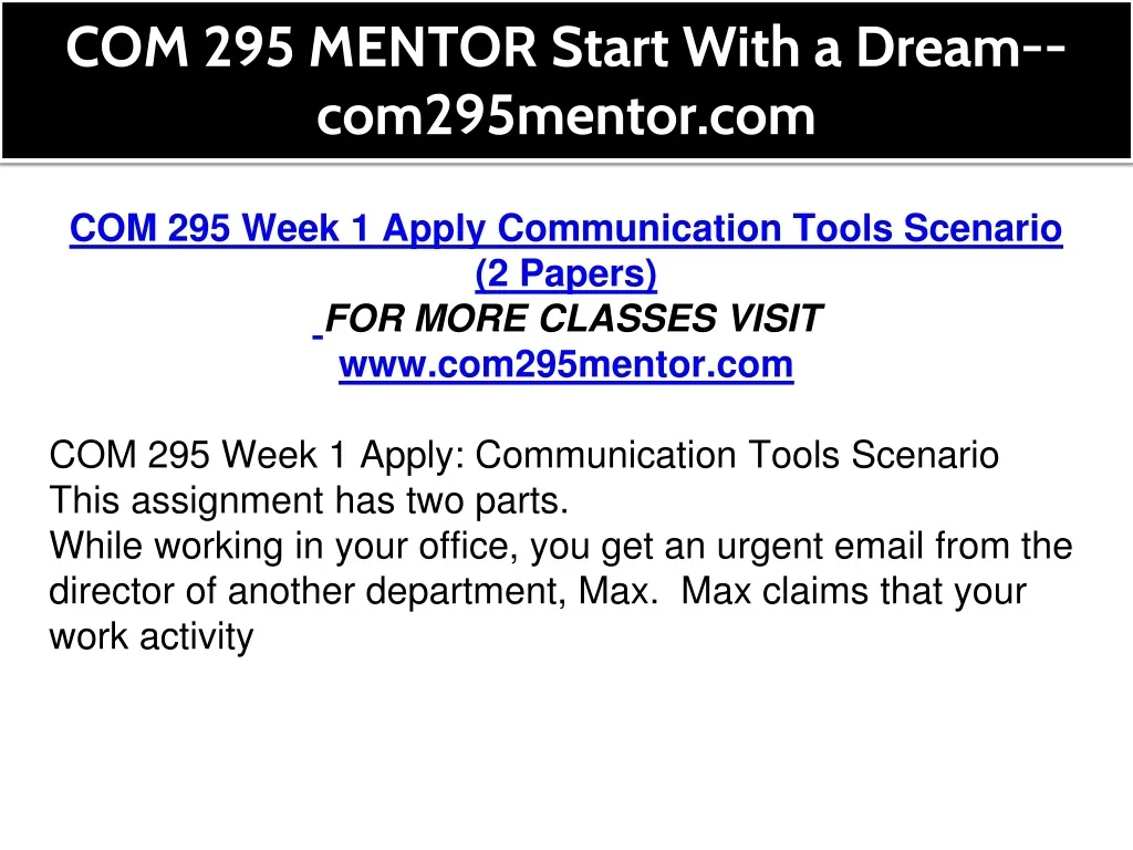 COM 295 MENTOR Start With a Dream--com295mentor.com • COM 295 Entire Course • FOR MORE CLASSES VISIT • www.com295mentor.com • COM 295 Week 1 Practice Going on a Business Trip to China • COM 295 Week 1 Practice Case Analysis Credibility for an Entry-Level Professional • COM 295 Week 1 Apply Communication Tools Scenario (2 Papers)