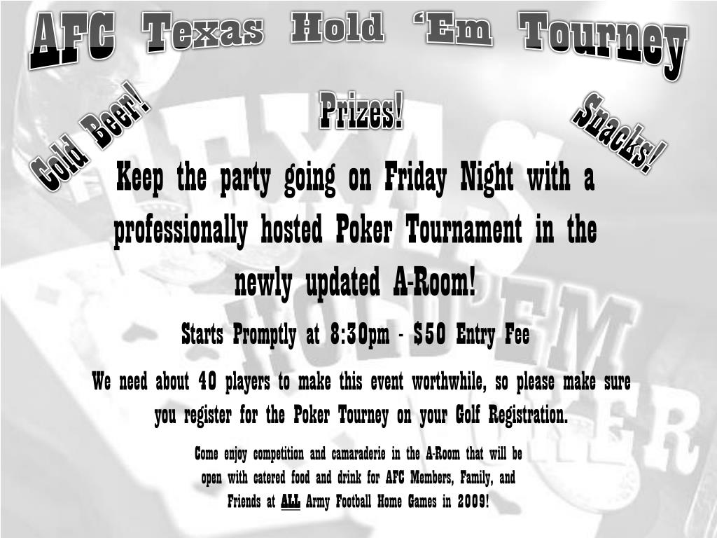 AFC Texas Hold ‘Em Tourney Prizes! Snacks! Cold Beer! Keep the party going on Friday Night with a professionally hosted Poker Tournament in the newly updated A-Room! Starts Promptly at 8:30pm - $50 Entry Fee We need about 40 players to make this event worthwhile, so please make sure you register for the Poker Tourney on your Golf Registration. Come enjoy competition and camaraderie in the A-Room that will be open with catered food and drink for AFC Members, Family, and Friends at ALL Army Football Home Games in 2009!
